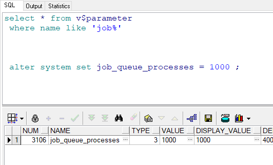 [ 오라클 user_job이 실행 안될때 조치 방법 ] 1) system계정으로 접속하여 아래 쿼리를 실행한다 select * from v$parameter where name like 'job%' ; 2) 쿼리 결과 job_queue_processes의 값이 0이면 user_job 실행 안됨 3) alter system set job_queue_processess = 1000 ; 으로 변경 4) user_job 실행 확인!!! JOB_QUEUE_PROCESSES는 DBMS_JOB 작업 및 Oracle Scheduler(DBMS_SCHEDULER) 작업의 실행을 위해 생성할 수 있는 인스턴스당 최대 작업 슬레이브 수를 지정합니다. DBMS_JOB과 Oracle Scheduler는 동일한 작업 조정자와 작..